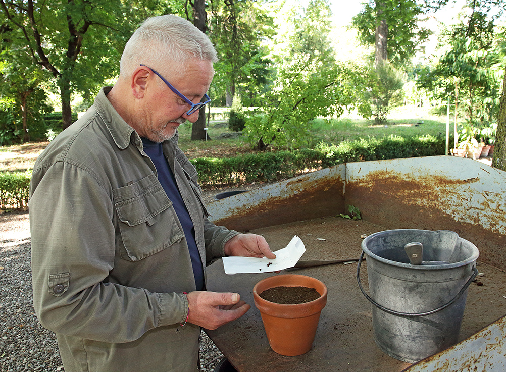 Luigi Fabiani si appresta a collocare i semi nel vaso